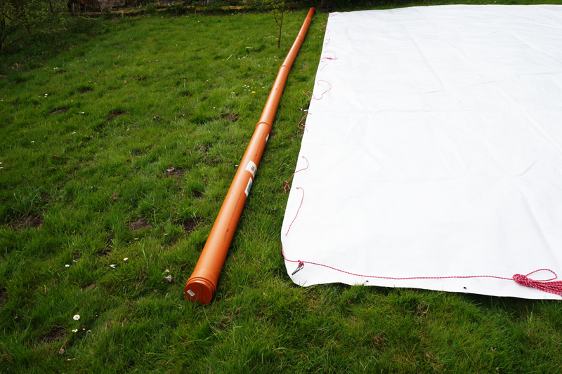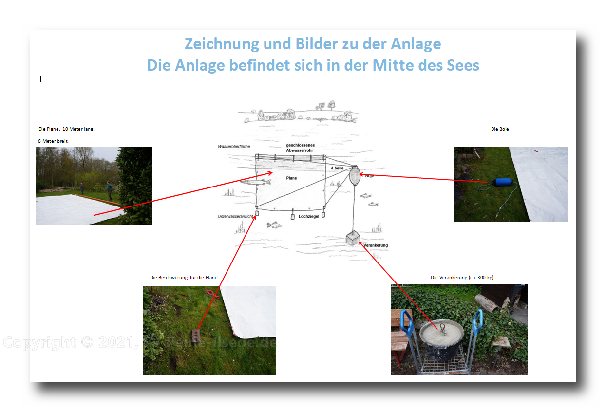 Für den Versuch verwendeten die Wissenschaftler als Vorhang eine Plane mit den Maßen 10 mal 6 Meter. Um die Plane oben schwimmen zu lassen und somit am Versinken zu hindern, wurde als Schwimmkörper ein geschlossenes Abwasserrohr verwendet, an welches die Plane befestigt wurde. Damit die übrige Plane im See hängt, wurden zur Beschwerung an der unteren Seite der Plane drei Gewichte angebracht. Hierfür wurden Lochziegel verwendet, die eine einfache Befestigung ermöglichen.