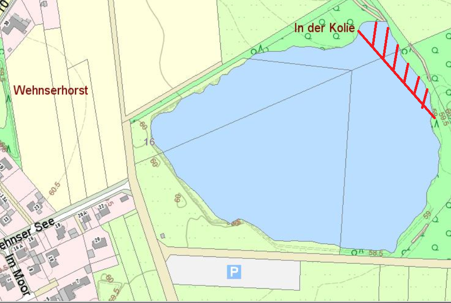 Aus Richtung Edemissen im Wehnserhorst rechts Richtung Plockhorst abbiegen und nach etwa 300m rechts in die Straße "Zum Wehnser See" abbiegen. Diese führt direkt zum Gewässer.